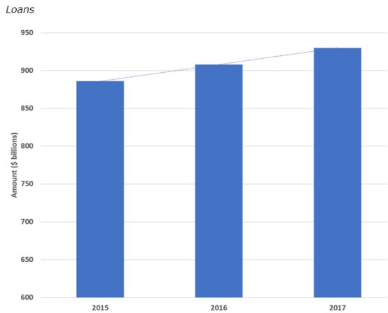 对于银行来说,存贷款是一个重要的指标。从以下两张图可见,美国银行的存款和贷款都在不断增加。