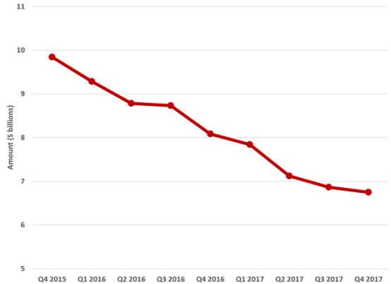 公司四季度发放贷款达9270亿美元,高出去年同期的9080亿美元。商业贷款有所增加,消费贷款相对稳定。美国银行总存款逐年增加。2017年四季度,公司总存款增至1.293万亿美元,高于去年同期的1.25万亿美元。除存贷款持续增长外,还值得注意的是,公司资产质量也在不断改善,这是笔者看好美国银行的重要原因。