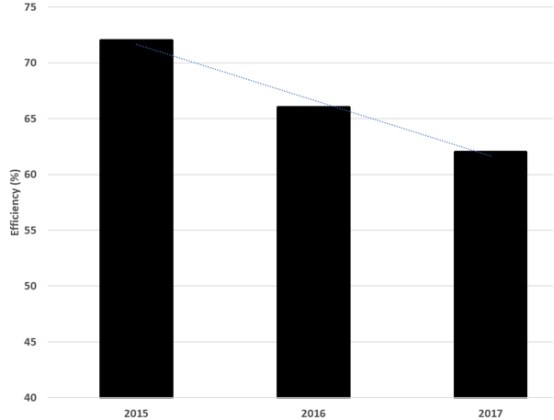 美国银行的效率是个不容忽视的问题。公司产生单位营收的开支过大。不过近几年来,情况有所好转。下图是近三年美国银行的效率比走势,公司的效率比不断改善,目前是62%,其中效率比表现最佳和最差的部门分别是全球银行部门和全球市场部门,两个部门的效率比分别为43%和77%。
