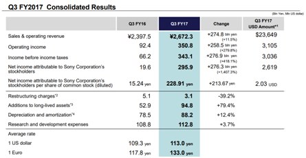 从2015年开始,索尼正式扭亏为盈,凭借PS4狂卖4000万台,公司实现净利润1478亿日元;随着公司近期重大人事调整的发出,公司2017财年第三财季业绩报告发布,公司第三财季营业利润达到了31.05亿美元,净利润约合26.19亿美元,同比增长1407.3%。