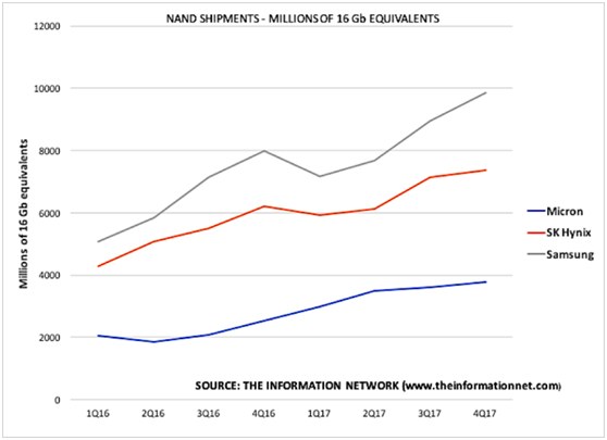 上图看出美光的DRAM出货量有提高,但是从下图看到NAND 是相反的情况。