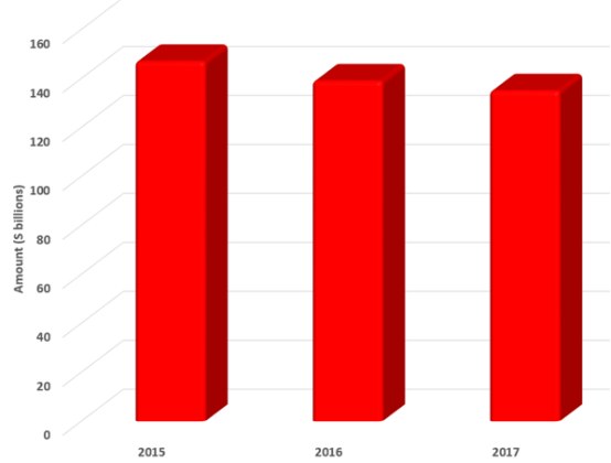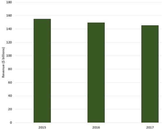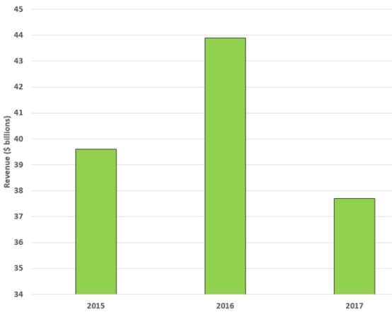 上图显示了通用近三年来的营收表现,可见公司营收波动较大,反映了业务转型期间的通用在去年所做出的调整。也就是说,其实通用四季度营收比笔者预期高出7.5亿美元。虽然通用营收同比下滑5.5%,但仍然大超笔者预期,这着实令人震惊。更重要的是,华尔街分析师对通用营收的一致预期是358.5亿美元,而笔者的预期甚至比华尔街的预期更高。不过总的来说,通用2017年营收相较2016年是在下滑。
