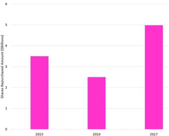股票回购能减少股票数量,从而使每股收益增加。2017年通用共将45亿美元用于股票回购。