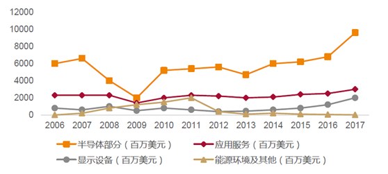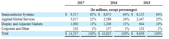 2017财年,公司营收分布主要集中在半导体,全球应用和显示市场,分别为:半导体设备(65%),全球应用服务(21%)和显示相关市场(13%)。