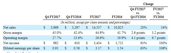 截止于2017年10月29的第四财季,公司营收39.7亿美元,同比增长20%;