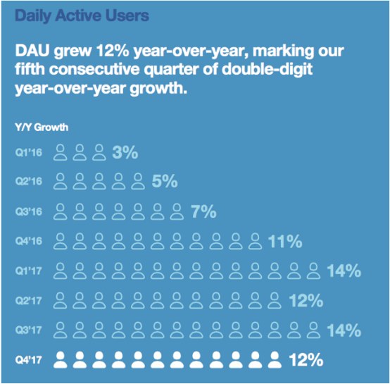 2017年四季度,推特日活跃用户数量同比增长24%。更重要的是,用户在推特上的活跃时间与过去18个月相比有了大幅增加。