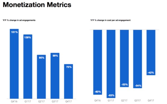 推特活跃用户数量大幅增长,同时广告成本降低,这使得公司对广告商而言变得更加具有吸引力。推特2017年四季度首次实现广告成本大幅降低,这是公司利用活跃用户增长变现迈出的第一步。