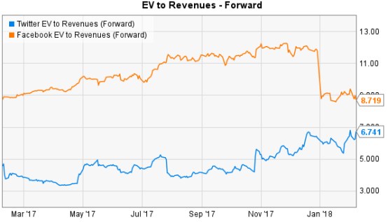 尽管推特和Faceook的变现能力差距很远,但就公司估值而言,推特比Facebook更具吸引力。推特目前的EV/S(企业价值与营收比率)已上升20%,远期EV/S为8,低于Facebook的8.7。