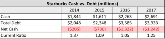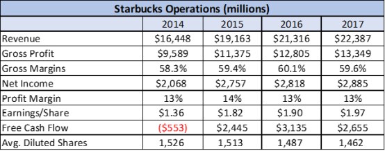 在过去的几年里,星巴克的业绩一直很稳定,收入、利润和每股收益持续增长,利润率也保持稳定。新店扩张的速度非常快,从2014年到2017年底数量增长了27%。过去4年里,星巴克花费了大约56亿美元回购股票。唯一的担忧是星巴克的负净现金头寸,抑制了收购的潜在可能,但这对于快餐连锁来说是很正常的事情。