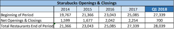 星巴克在全球开设了700家新门店,在76个市场中,门店总数达到28,039家。