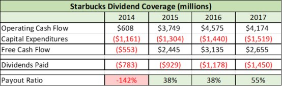 关于星巴克,最让投资者喜欢的一件事就是它不断增长的分红,从2010年开始,每年都在增加。股息也在以快速的速度增长,在过去的3年里每年至少增长20%。星巴克在其自由现金流覆盖方面也处于有利地位。从下面的表格可以看出,星巴克的分红处于一个安全的位置(就支付比率而言),而且只要业绩保持增长,分红就有足够的空间保持增长。