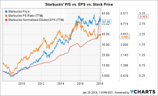 我认为,以过去10年的平均水平为基础,星巴克目前的估值是非常合理的。虽然星巴克的市销率增加了,由于盈利能力增长(见每股收益增长),所以价格上涨的倍数是合理的。更值得注意的是,自2015年底以来,股票价格和每股收益的背离,这在特朗普上台后美股的反弹中,这是罕见的,因为许多股票都在创新高,但这实际上是新估值倍数的结果。而星巴克的股票价格与其在销售或收益方面的实际表现更具有相关性,这对于投资者来说是件好事。