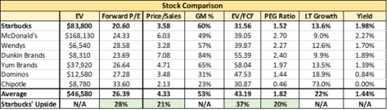 上表中,通过使用雅虎财经所列的P/E和PEG来获得增长率。保守的单阶段贴现现金流模型显示,星巴克的估值很合理。