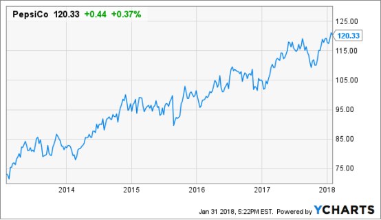 下面是百事公司五年的K线图,在五年的时间里,它一直处于持续的强劲增长中。