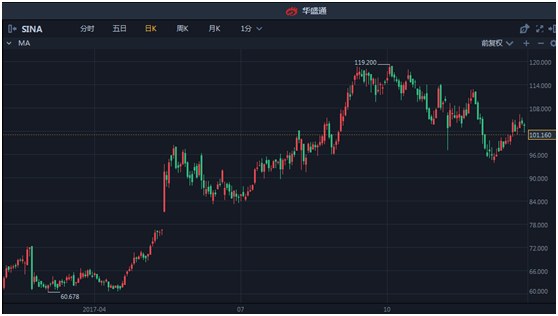 2017年,作为我国互联网巨头之一的新浪,股价涨势喜人,从年初的50美元,屡破新高,2017年股价最高接近120美元。