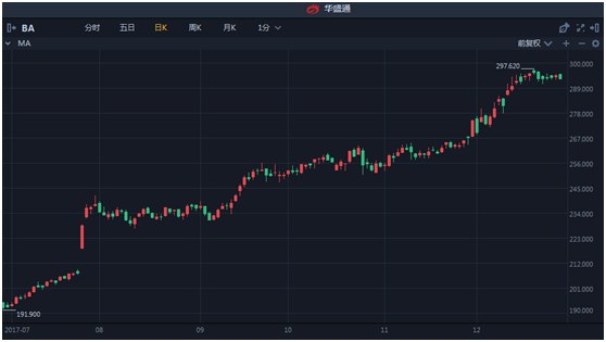 作为世界航空业巨头公司,波音在2017年股价走势可谓辉煌;随着波音787项目生产规模的扩大,公司的未来前景可期。
