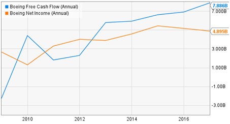 通过下图可以看出,波音去年盈利82亿美元,而公司的自由现金流则达到117亿美元,造成这种差异的主要原因是波音787项目,因为会计准则的问题,目前该项目是没有盈利的,而且成本已经递延确认,但是从现金流考虑,该项目则是盈利的。