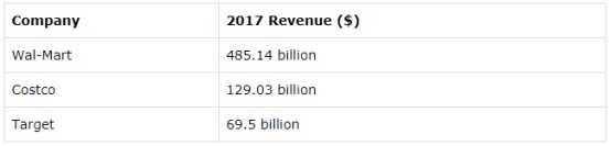 投资者一直都很关注沃尔玛。下图显示了沃尔玛及其竞争对手好市多和塔吉特的217年营收数据,可见沃尔玛的表现远远优于其他同行。