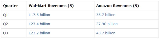 下图是沃尔玛和亚马逊2017年前三个季度的营收对比,显而易见,沃尔玛这三个季度的营收表现都好过亚马逊。