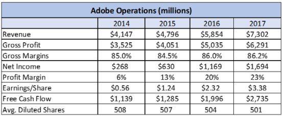 从业绩来看,笔者更中意Adobe。Adobe营收增速稳健、且毛利率不断提升,因此公司的自由现金流也十分充裕。Adobe将部分自由现金流用于回购股票,这也是笔者所乐见的,因为这对投资者来说是利好消息。随着营收增长,公司利润应该会继续增加,进行股票回购后,股票总数会减少,因此每股收益会进一步增加。过去三年内,Adobe的营收增速为76%,净利润和自由现金流增速分别高达531%和140%。
