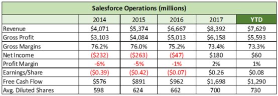 Salesforce的营收增速比Adobe还快,但利润增速不及Adobe,且毛利率表现也欠佳。笔者能理解Salesforce利润增速不够出色的情况,因为公司为了吸引新用户花费大量资金,但利润率的紧缩是个小小的担忧。过去三个财年中,Salesforce营收增速为106%,净利润和自由现金流增速分别为177%和195%,且公司平均稀释股数有所增加。