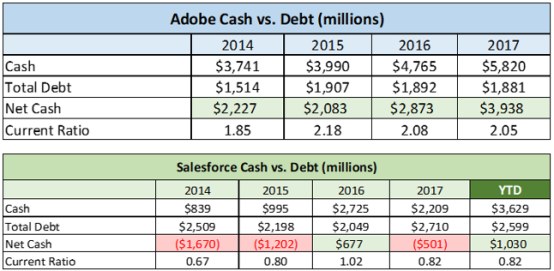 从财务状况来看,Adobe拥有更多的现金流、更低的财务杠杆以及表现更佳的流动比率。这样一来,Adobe财务的灵活性更高,未来或许还能进行收购行动。