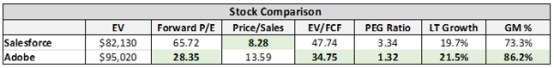 过去一年中,Adobe(NASDAQ: ADBE)和Salesforce(NYSE: CMR)的股价表现都十分不错,涨幅分别为81%和50%。尽管股价已经大幅上涨,笔者仍然认为这两只股票是不错的投资选择,有充足的上行空间。本文将对两只股票进行简要对比。