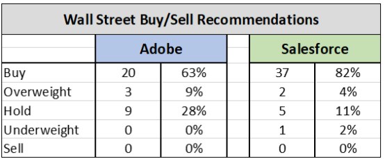 华尔街分析师更看好Salesforce。根据MarketWatch,分析师给予Salesforce的平均目标价为122.49美元,相对当前股价有8%的上涨空间。分析师给予Adobe的平均目标价为215.48美元,相对当前股价有7%的上涨空间。此外,在分析师给Salesforce的股票评级中,82%的评级都是“买入”。