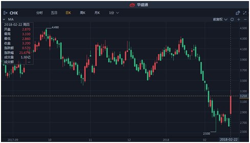 由于需要偿还13亿美元的债务,切萨皮克能源在2017年出售资产以恢复增长,因此公司股价在2017年一路下跌;受到最新财报超过预期影响,公司股价昨晚大涨21.67%,股价达到3.20美元。