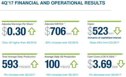成本方面,公司2017年第四季度控制得当,运营成本达到21.14亿美元,同比下降8%;生产成本每桶油当量为2.50美元,降幅同比达到16%。
