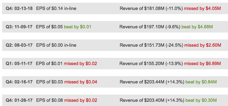 该公司总是营造出积极的故事,但是财务数据却总是拖后腿。第四季度,营收同比下滑11%,再次不及分析师预计。从数据看,至少有6个季度公司EPS或者营收总有一项不及预期。