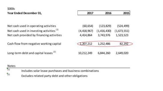 从年报的这张表可以看出,特斯拉完全依赖外部资本来维持业务,从运营中获得现金流的程度已经比去年有所改善,所有的改善都来自于临时营运资金来源,因为生产线上的项目都是赤字的。由于特斯拉没有盈利,它必须通过借贷来维持正常运营。上述表格的最后一行显示了这一点的最终影响,自2015年以来,某些债务负担从2.7亿美元增至10.2亿美元。