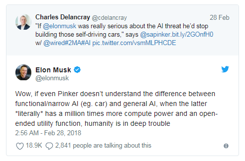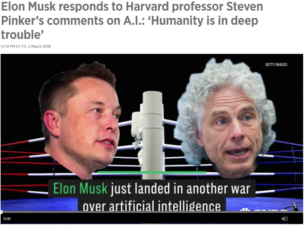 Elon Musk 最近与Steven Pinker(史蒂芬·平克,著名的认知心理学家和科普作家,TED演讲人、世界超级语言学家,图右)开吵,说Pinker不懂广义AI与狭义AI的区别。之前Elon Musk还与Mark Zuckerberg开吵,说Zuckerberg对AI懂得有限。当然,Musk都是反击式的,因为那两位名人都说Musk的AI威胁论有些太夸张了。不过,之前Rodney Brook说过他不认为Elon Musk真懂AI。