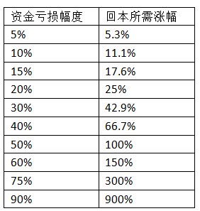 如果初期亏损,后期回本所需要的涨幅则大得多,这一点特性与杠杆ETF类似,具体的数据如下,可以看到,如果资金亏损一半,后期需要一倍的涨幅才能回本。因此,及时止损几乎是投资中的一条铁律。
