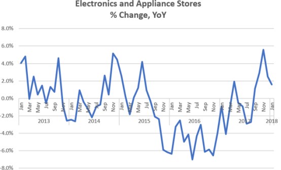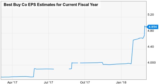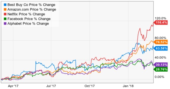 Bestbuy(NYSE: BBY)是全球最大的家用电器和电子产品零售商。公司不属于热门科技概念股“FANG”的一员,但Bestbuy的股价表现超过其中两家公司,成为没落实体零售业中的幸存者。在实体零售举步维艰的背景下,Bestbuy的同店销售额实现同比增长,2017年四季度更是同比大增9%,预计2018年公司的优秀业绩还将继续。Bestbuy估值仍然偏低,各项增长指标表现改善,笔者认为这是一只值得关注的股票。