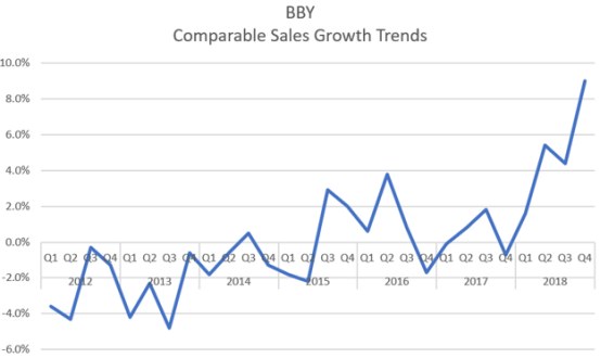 在电商亚马逊的激烈竞争下,实体零售处境艰难,但在消费科技大热的利好之下,Bestbuy并未被电商打倒。多数零售商在美国假日购物季的业绩都表现不错,但Bestbuy横扫各大零售商,同店销售额大增9%,远超分析师预期的3%。至此Bestbuy已实现连续三个季度同店销售额以5%左右的速度增长。Bestbuy在这三个季度中的首次实现同店销售额增速约为5%时,公司管理层称这样的增速不会是新常态。尽管如此,Bestbuy成功将增速延续下去,公司最终实现2018财年同店销售额增速达5.6%。