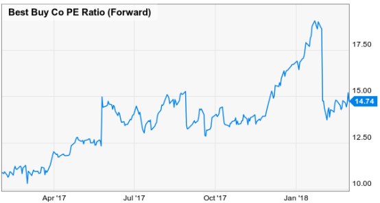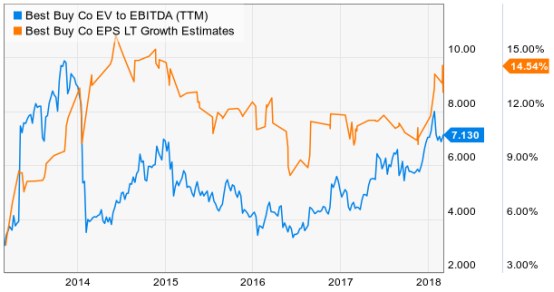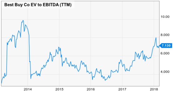 管理层预计2019财年公司每股收益将为4.9美元,照此计算,公司的远期市盈率为15,高于过去五年平均的14以下。Bestbuy的企业价值倍数同样处于多年高点。