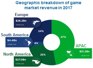 目前游戏产业的格局已经发生了巨大的变化,亚太地区已经几乎占领全球游戏产业收入的一半,从下表可以看出,亚太地区47%的收入份额远远高于北美的25%和欧洲的24%。
