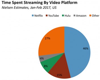 从上图中可以看出,各大平台,奈飞占据46%的份额,其次为油管的15%,Hulu的8%,去年炒的比较多的亚马逊仅为4%,显然,奈飞占据了美国绝大多数家庭的客厅。