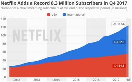 公司去年推出了100多部热门剧集和电影,内容超过1000小时,公司在高品质内容的制作将延续到2018年,众多最新原创内容要比电视网络等反复播出的剧集具有明显的吸引力。