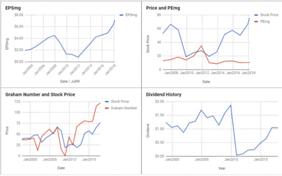 对Verizon通信公司的进一步研究显示,该公司的股价高于格雷厄姆系数(29.66美元)。该公司的股息为每股2.34美元,收益率为4.8%,是目前股息最好的股票之一。PEmg(每股价格/每股收益——现代格雷厄姆)为10.71,低于行业平均水平(37.96),从这些估值指标可以看出该公司为业内估值最低的股票之一。后,该公司股票的交易价格比流动资产净值(NCAV)低45美元。