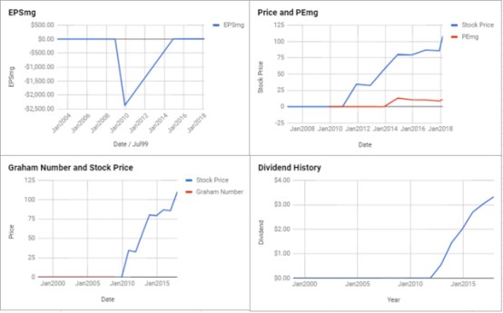 吉利德科技公司的EPSmg(标准化盈利)从2014年的3.61美元增长到2018年的7.05美元,似乎被低估了。在未来7-10年里,这一收益增长的水平超过了预期的市场1.33%的年均收益增长率。根据现代格雷厄姆的估值模型结果,其内在价值的估值远高于当前市场价格。