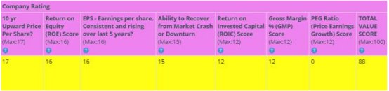 根据BTMA Stock Analyzer的排名,星巴克名列100家最佳公司名单中的第88位。公司的股本回报率有出色表现,每股收益持续增长,并且有从低迷中恢复的能力,投资资本回报率以及毛利率都有亮眼表现。由于星巴克近几年的增速放缓,因此PEG(市盈率相对盈利增长比率)指标表现欠佳。