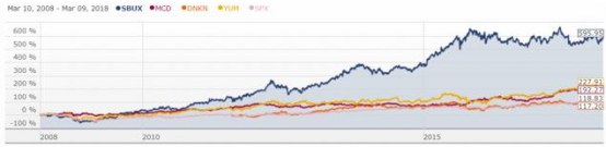下图展示了星巴克、标普500指数以及麦当劳等同行公司近十年的股价走势。星巴克过去十年的股价涨幅惊人,远超大盘和麦当劳等同行的表现。近几年中,大盘和其他同行股价继续逐渐上涨,但星巴克股价却上涨不多。星巴克的同行股价和大盘走势较为一致,但星巴克却并非如此,股价变动并不跟随大盘的变化。