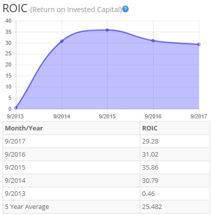 投资资本回报率(ROIC)是衡量一只股票最重要的指标之一。投资资本回报率能展示公司借助投资资本获利的能力,可以作为投资某只股票能否获得满意回报的参考。与行业内其它公司相比,星巴克过去五年的投资资本回报率表现出色。但可以看出的是,星巴克过去两年中的投资资本回报率略有下滑,这是公司增速放缓导致的。此外,由于2013年受到巨额罚款的影响,星巴克当年的投资资本回报率严重受挫。
