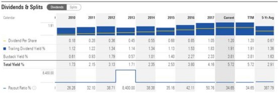 星巴克的股息率每年持续稳步增长,目前的股息率约为2%。股息支付率通常在40%左右或低于40%,因此公司还有很大空间可以继续上调股息。