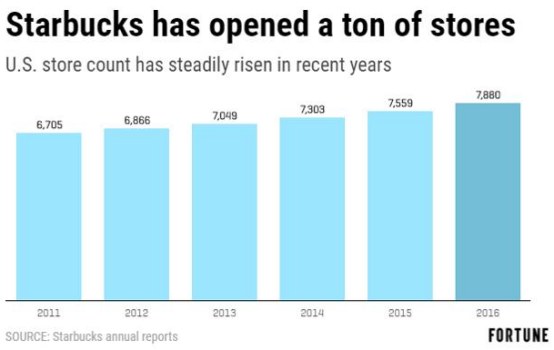 尽管星巴克在美国的扩张遭受质疑,但公司仍然在美国继续新开门店。2017年,星巴克在全球范围内新开700家门店,公司门店总数已高达28039家。
