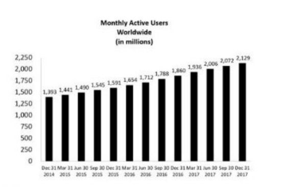 截至2017年底,Facebook的月活跃用户数为21.2亿。