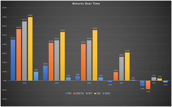 从过去几年的股价回报看,迪士尼都跑输大盘。