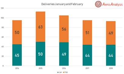 其实公司的股价的真正下跌原因,波音自己已经把答案发布了出来,通过下图可以看到,公司今年一月、二月的交付数据,通过对比不难发现,今年的头两个月交付量可以说是近五年来的最低水平,这就引发了人们对于公司第一季度业绩的担忧:波音预计第一季度的美股收益约占全年的15%,这与此前分析师预计的18%存在一定的落差,所以才会出现股价下跌的情况。